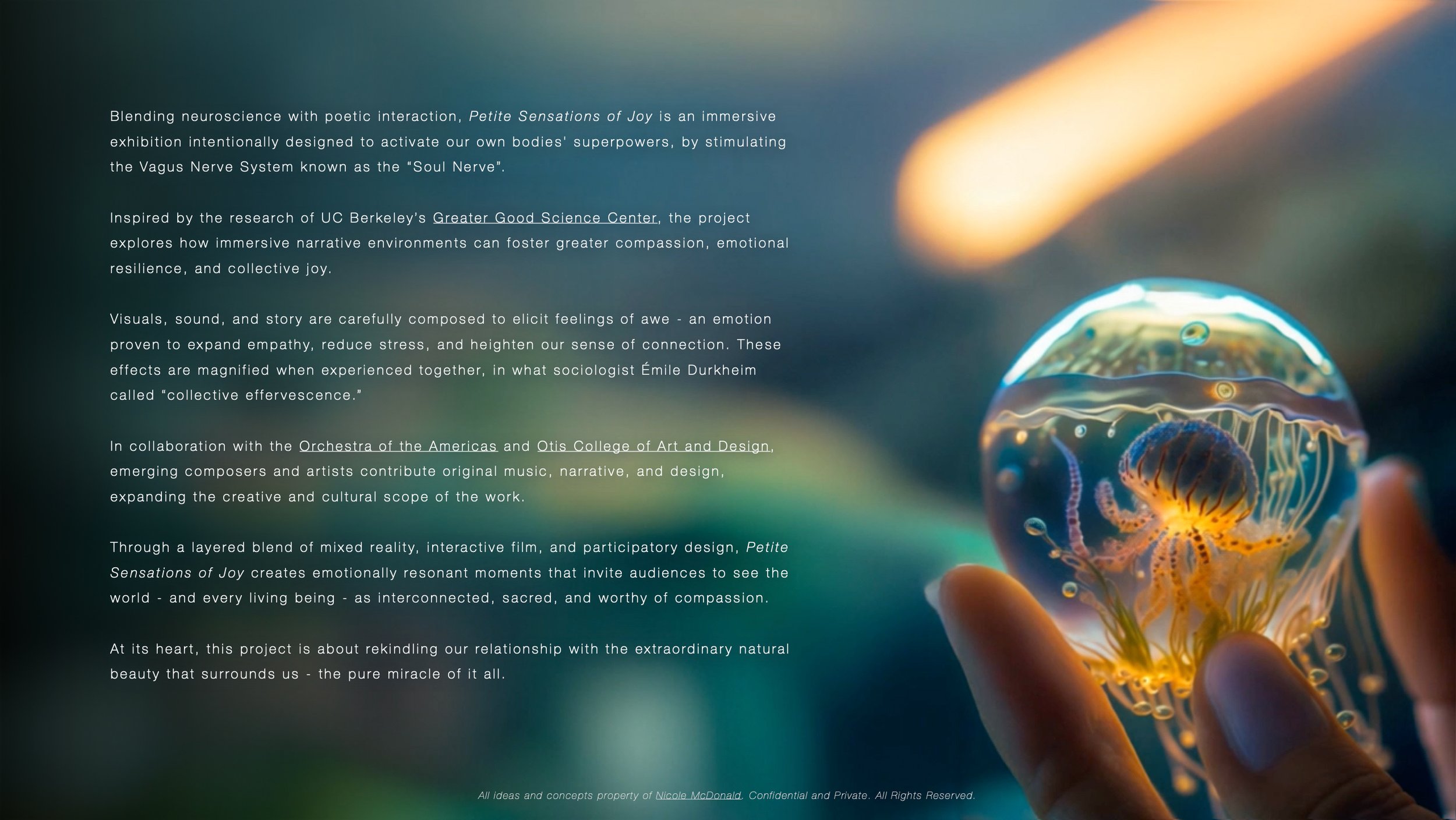 Petite Sensations of Joy is an immersive exhibition blending mixed reality, storytelling, and multi-sensory haptics to spark awe, joy, and human connection. Grounded in neuroscience, it intentionally stimulates the body’s Vagus Nerve, helping ease stress, lift the spirit, and foster empathy, emotional resilience, and shared wonder. The exhibition is amplified through collaboration with the Orchestra of the Americas and Otis College of Art and Design, and is currently fundraising for a planned premiere at Venice Biennale Cinema 2026, following my participation as a Fellow at Biennale College Cinema 2023 and in the Venice Production Bridge 2023.